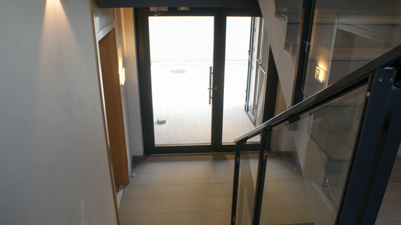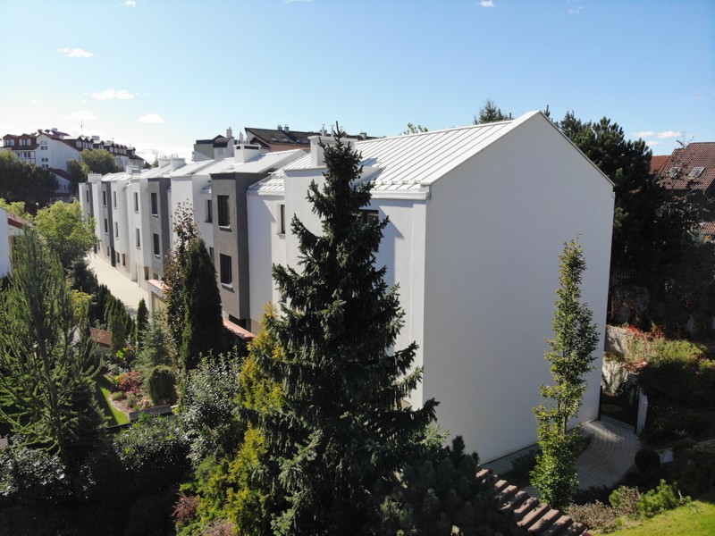 Elewacje częściowo pokryte są płytami elewacyjnymi (fasada wentylowana) oraz tynkiem szlachetnym.